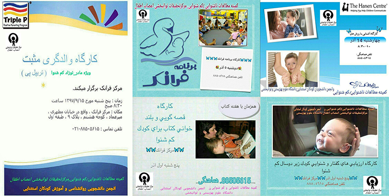 به گزارش وبدای دانشگاه علوم بهزیستی و توانبخشی، این مجموعه از کارگاه های آموزشی مربوط به مداخلات زودهنگام در کم شنوایی تحت عناوین " گفتار نشانه دار، تریپل پی والد – کودک کم شنوا، گایدلاین اختلالات ارتباطی WHO، قصه گویی برای کودک کم شنوا، روش هنن، برنامه والد – کودک فرانک ، ارزیابی های گفتاری کودک زیر دو سال " اجرا شد.