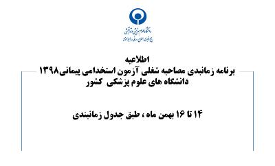 اخبار > اطلاعیه شماره 1 - برنامه زمانبندی مصاحبه شغلی از دعوت شدگان آزمون استخدام پیمانی 1398، دانشگاه های علوم پزشکی کشور