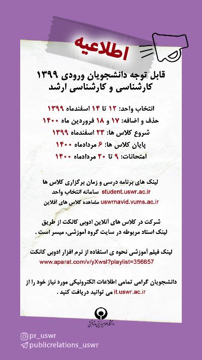 اخبار > قابل توجه دانشجویان ورودی 1399 کارشناسی و کارشناسی ارشد / تاریخ انتخاب واحد 12 تا 14 اسفندماه جاری