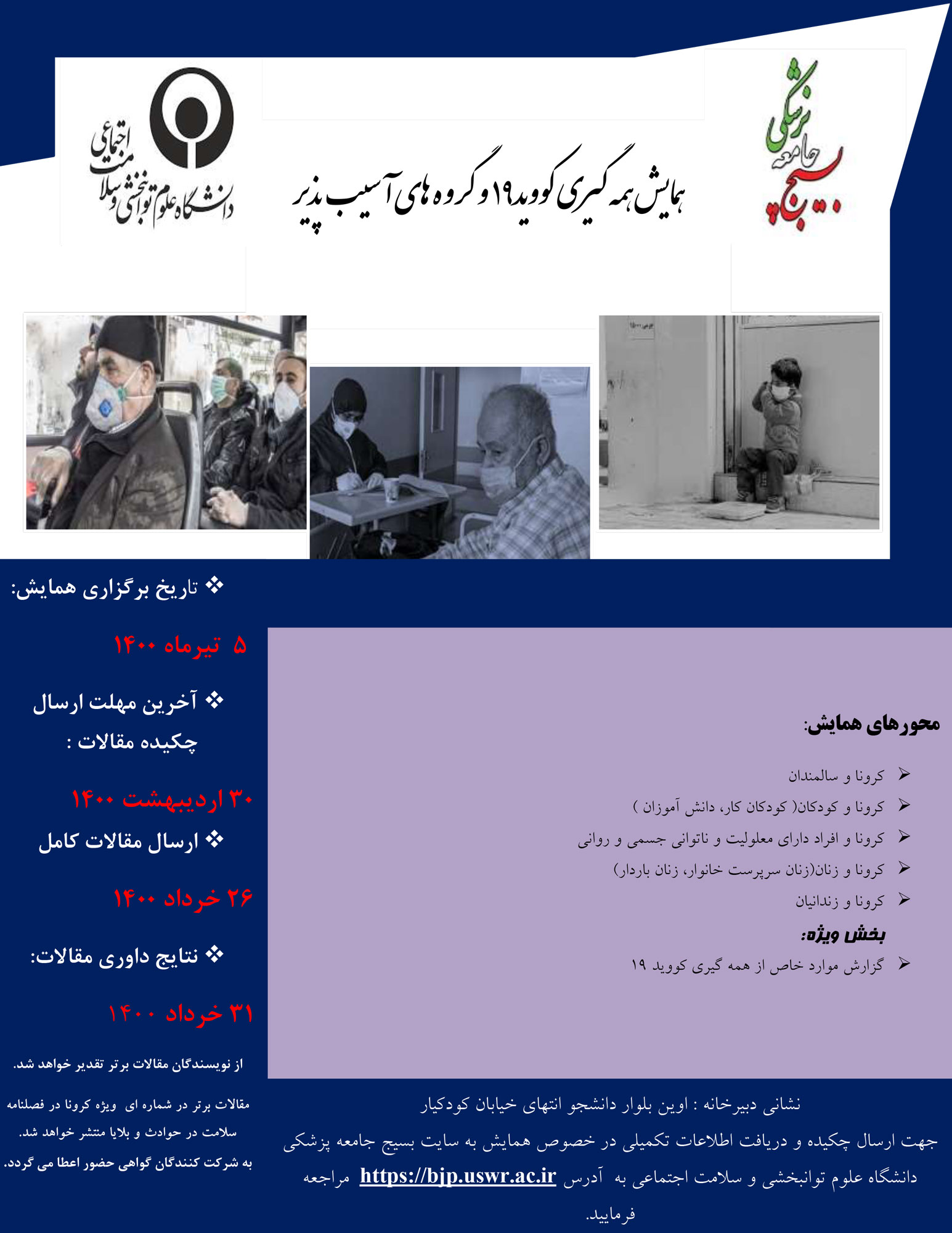 اخبار > همایش همه گیری کووید 19 و گروه های آسیب پذیر، پنجم تیرماه برگزار می شود/ مهلت ارسال مقالات، 30 اردیبهشت ماه