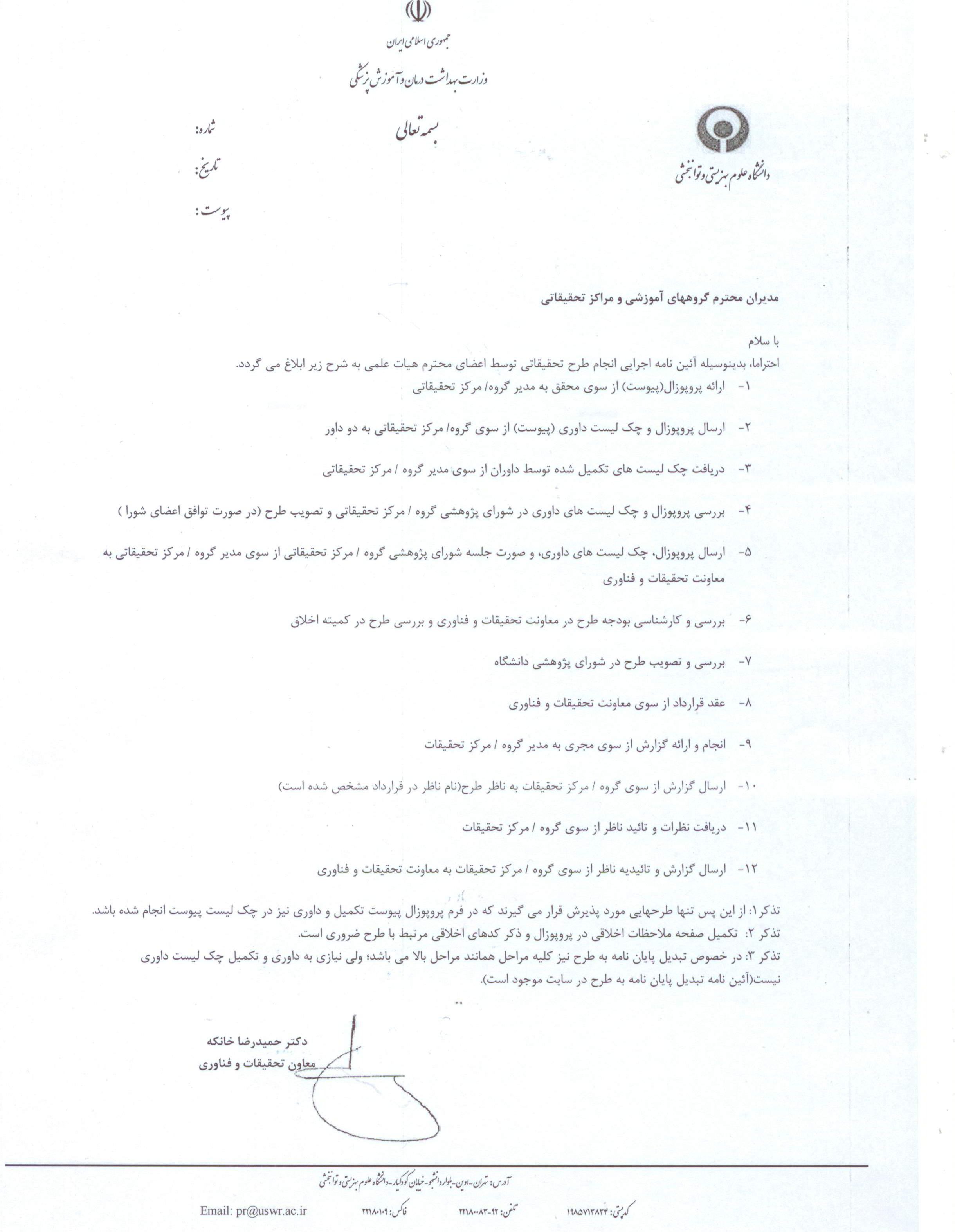 معاونت تحقیقات و فن آوری اطلاعات :ابلاغ آئین نامه اجرایی انجام طرح تحقیقاتی توسط اعضای محترم هیئت علمی: